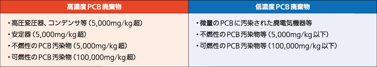 PCBは濃度等により、高濃度PCB廃棄物と低濃度PCB廃棄物に分類されます。